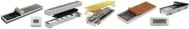 Іноді радіатори, що вбудовуються в підлогу та мають малу теплову потужність із природною конвекцією, для підвищення економності й енергопродуктивності опалювальної системи, комбінуються з іншими обігрівальними пристроями