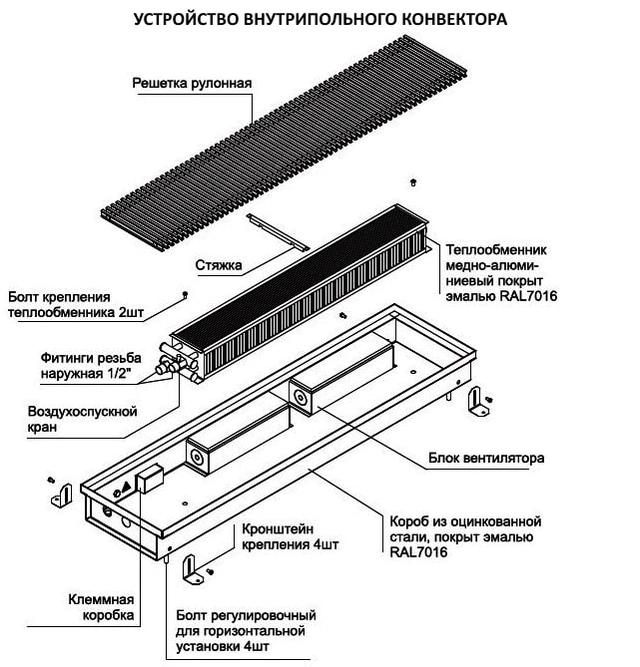 Основний елемент — теплообмінник з алюмінію, латуні або міді. У комплекті з водними трубками він поміщений у металевий корпус, до якого зверху приварені пластини. Завдяки постійній циркуляції нагрітого теплоносія, теплообмінник передає своє тепло на металеві пластини. А прогрівання приміщення здійснюється по всьому периметру. До комплекту може входити нагнітальний вентилятор та різні аксесуари (розпірні дюбелі для кріплення, гвинти для регуляції рівня корпусу в коробі/заглибленні, крана Мавського та ін.). Зовні корпус приладу пофарбований порошковою фарбою/емаллю й завжди покритий декоративною решіткою.