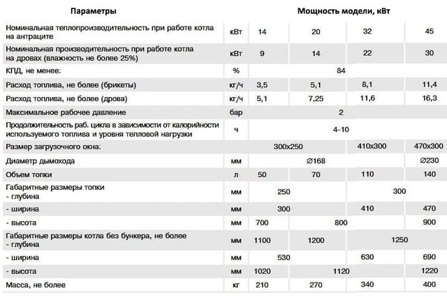 Технічні характеристики моделей ECO LONG BURNING 14-45 Квт