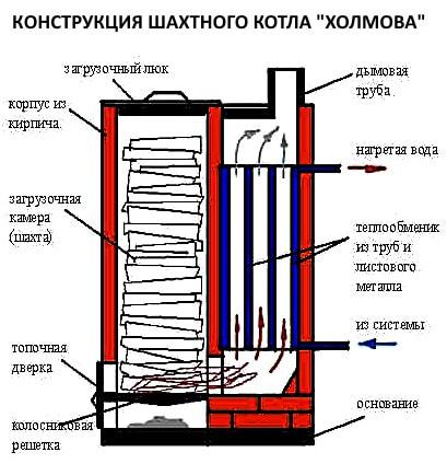 Топка виконана, як у всіх шахтних котлах - витягнута вертикально, у вигляді шахти, поділена на два відсіки - паливний і з теплообмінником пластинчастого типу. В паливний відсік дрова закладають пошарово, як у колодязь